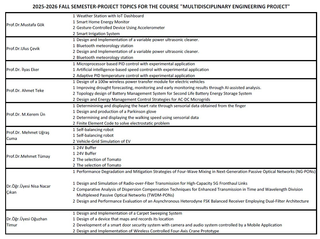 2025-2026 FALL SEMESTER-PROJECT TOPICS FOR THE COURSE "MULTIDISCIPLINARY ENGINEERING PROJECT"